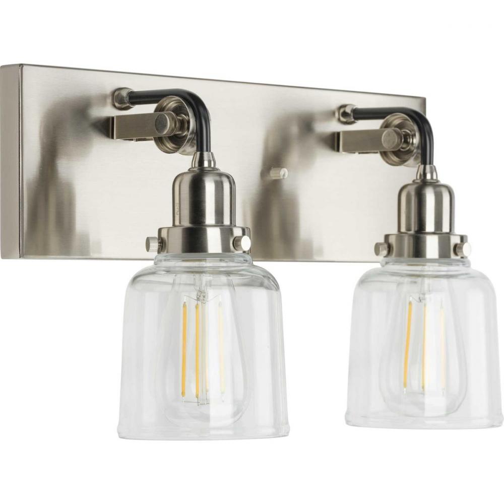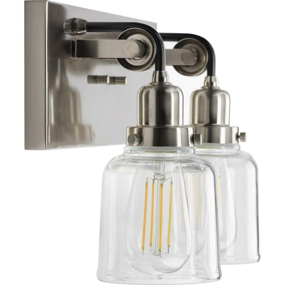 Ideal for a bathroom and powder room.;Perfect for farmhouse and urban industrial style settings;Beautiful brushed nickel finish with black accents;Crisp clear glass shades;Mount the light fixture facing up or down;Use 2 medium base bulbs that are sold sepa