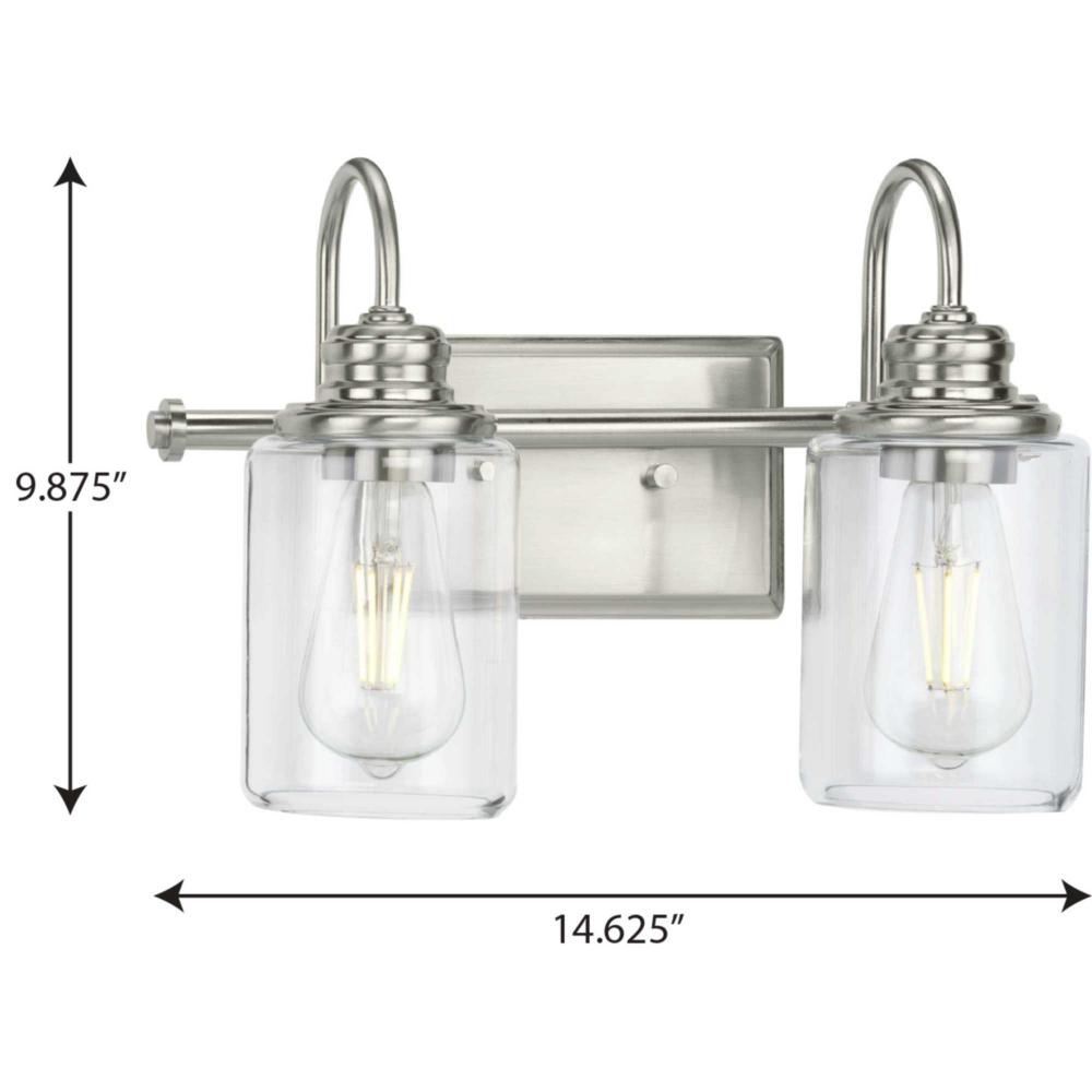 Application: Enjoy delightful charming details with the Aiken Collection 2-Light Brushed Nickel Clear Glass Vintage Bath Vanity Light ideal for any entryway, hallway, foyer, bedroom, sitting room, living room, or bathroom.;Styles: Perfect for farmhouse, co