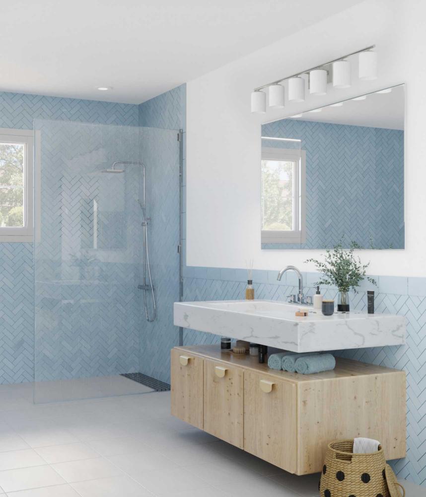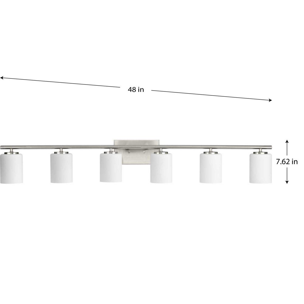 Fall in love with a lighting experience that epitomizes relaxed elegance by mingling functional design with subtle, sophisticated forms with the Replay collection’s modern six-light bath and vanity bracket. A smooth, circular backplate coated in an understated brushed nickel finish sets a tone of refined aesthetic taste. Smooth, round bars conjoin at crisp right angles to hold small, circular light bases that further accentuate the fixture’s stylishly simple demeanor. Crisp, cylindrical etched glass shades elegantly rest on the metal light bases as they exude a quiet confidence ready to illuminate any tired mind or body in need of a restorative glow. For optimal illumination, the bath bracket uses six medium base bulbs that are sold separately (60w max – LED, CFL, halogen, or incandescent). With the ability to be fully dimmable with dimmable bulbs and having the approval to be installed in damp locations, the light fixture offers endless versatility when it comes to finding a place in your home décor vision. The bath bracket’s air of simple sophistication is ideal for any bath and vanity setting in coastal, luxury, modern, and transitional interiors.