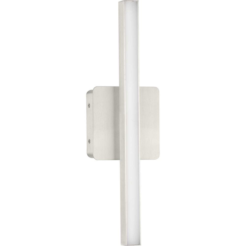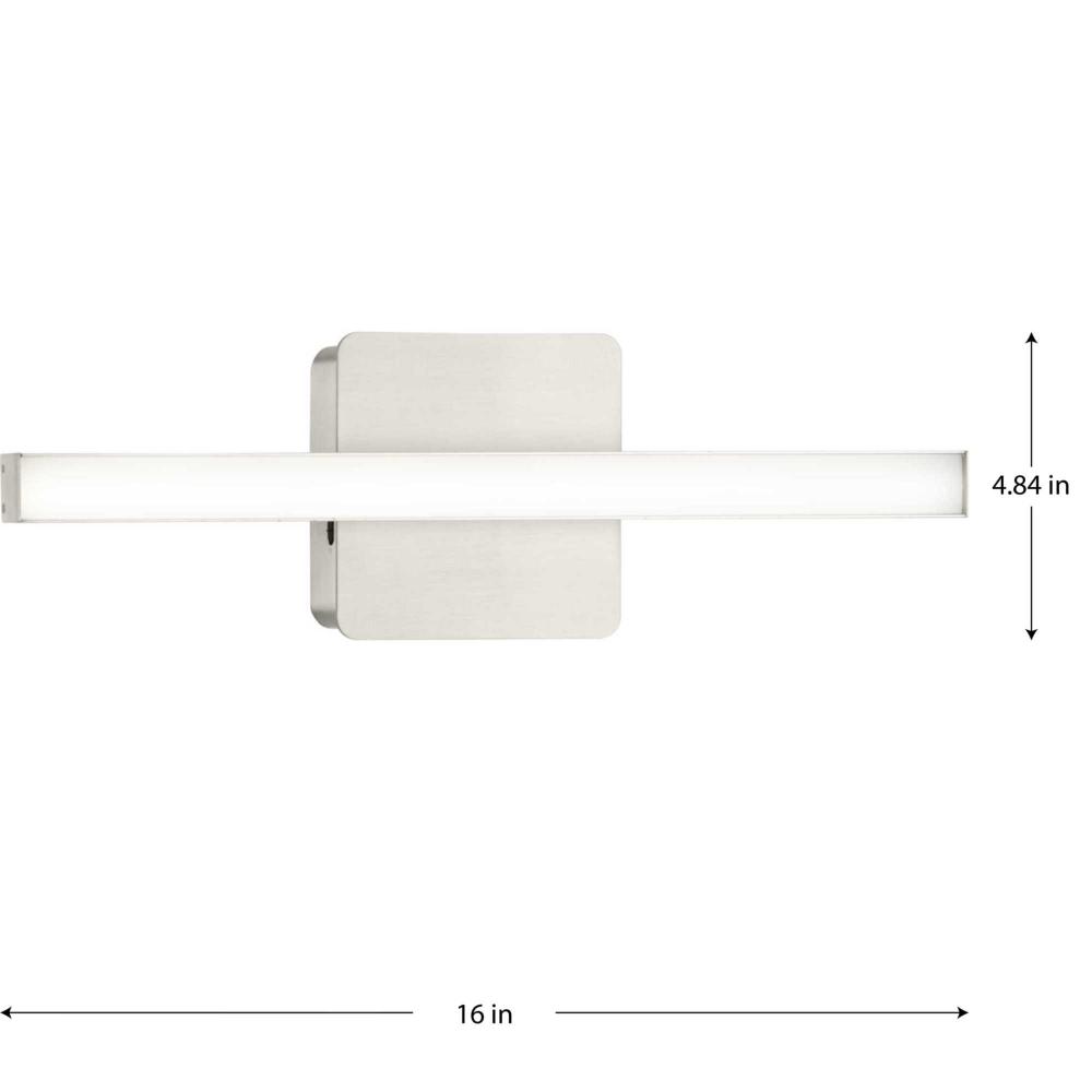The Phase 4 Collection Small LED Linear Vanity Light features color selectable technology and a sleek and minimal composition. A smooth square backplate finished in soft brushed nickel anchors the fixture, supporting a slim rectangular acrylic shade that creates a soft, uniform and energy-efficient light at 3000K, 4000K or 5000K. This versatile luminaire can be mounted as a wall sconce or as a vanity light above sinks and vanities, lending its surroundings a tailored touch. The bath light's versatile design is ideal for any bathroom in contemporary or modern commercial or residential settings. Progress Lighting products are designed for exceptional quality, reliability, and functionality.