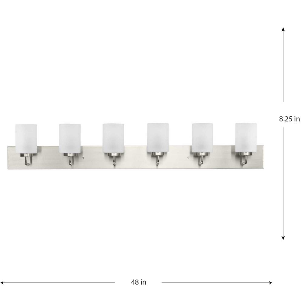 Incorporate a clean, contemporary design with the Merry Collection 6-Light Etched Glass Brushed Nickel Transitional Bath Vanity Light. Light sources glow from within crisp etched glass shades for a generous elegant glow sure to transform any bath into a modern retreat. The rectangular backplate, curved arms, and round light bases are coated in a beautiful brushed nickel finish that perfectly blends transitional and modern character. For ideal illumination, use 6 medium base bulbs that are sold separately (100w max - LED/CFL/incandescent). The bath light is compatible with dimmable bulbs. The bath vanity light's contemporary design is ideal for any bathroom in modern and transitional style settings. It's time to breathe new life into the mundane every day with timeless and truly transformative lighting. Make your purchase today to begin your journey to a whole new lighting experience. Progress Lighting products are designed for exceptional quality, reliability, and functionality.