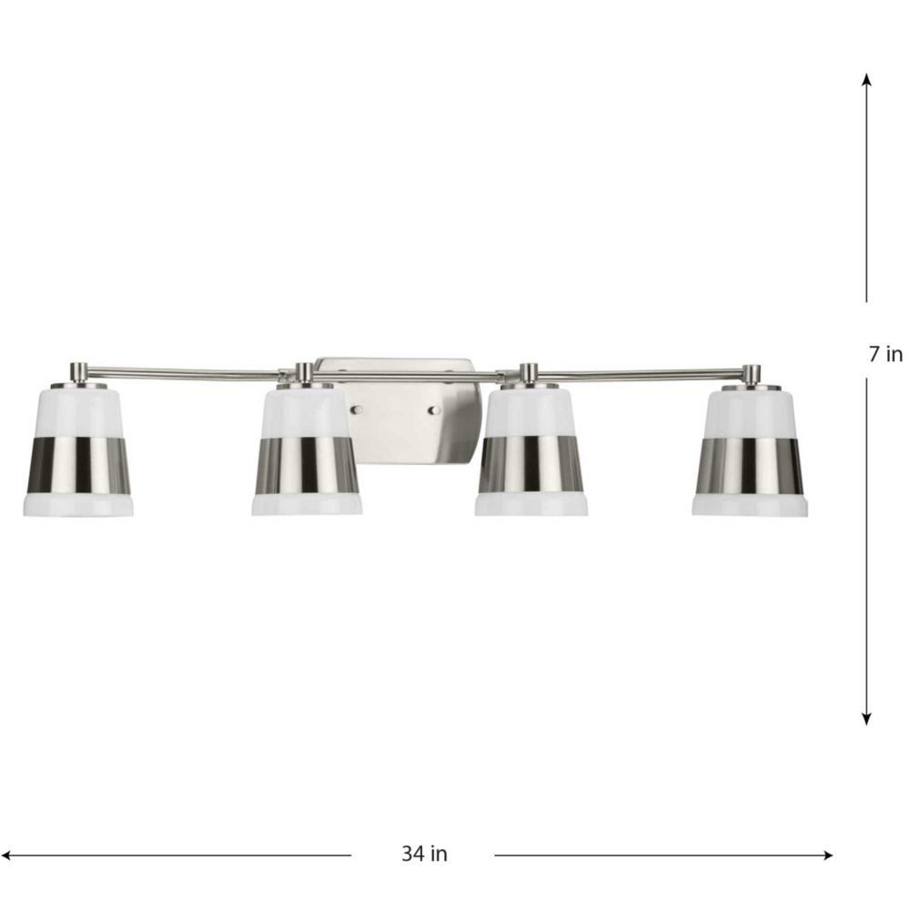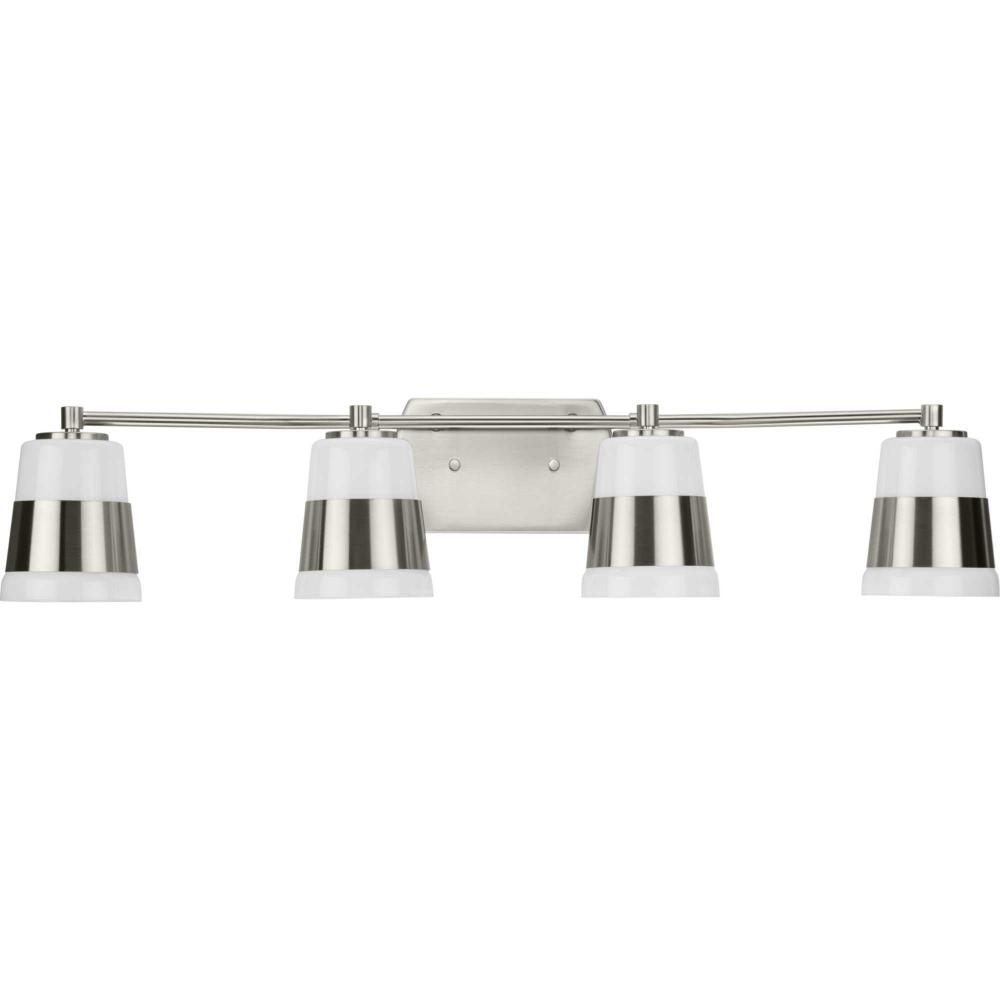 The Haven Collection is practical and stylish with a modern color blocking silhouette that fits perfectly in luxe industrial and contemporary rooms. The metal frame is finished in subtle brushed nickel and features shades suspended from an oblong backplate. Etched opal glass casts a pleasing, softened glow in bathrooms and powder rooms. This versatile fixture can be mounted up or down, increasing its design flexibility. It is cULus damp location listed, with a one-year warranty to guarantee your complete satisfaction. Progress Lighting products offer exceptional quality, reliability, and functionality.