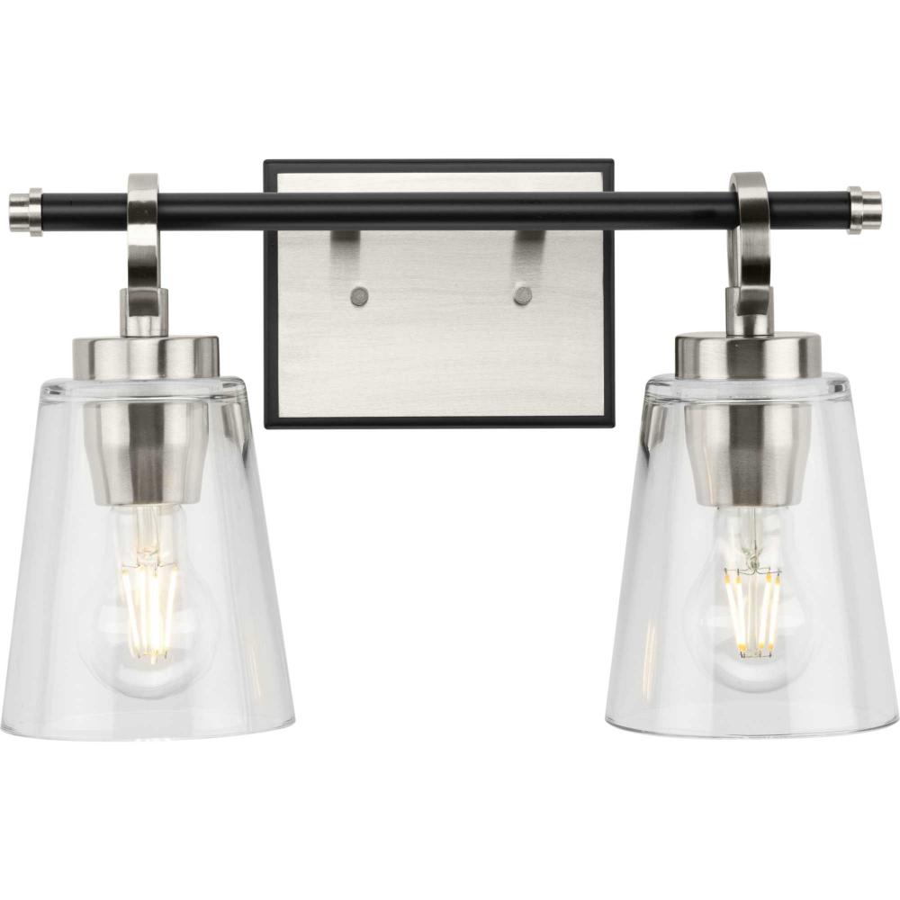 The Cassell Two-Light Vanity Fixture brings an enduring style to the bath. The light boasts a dual-tone finish of Brushed Nickel and Matte Black that accentuates its distinguished and handsome design. Tailored details smoothly blend linear precision with elegant circular rings and clear glass shades.