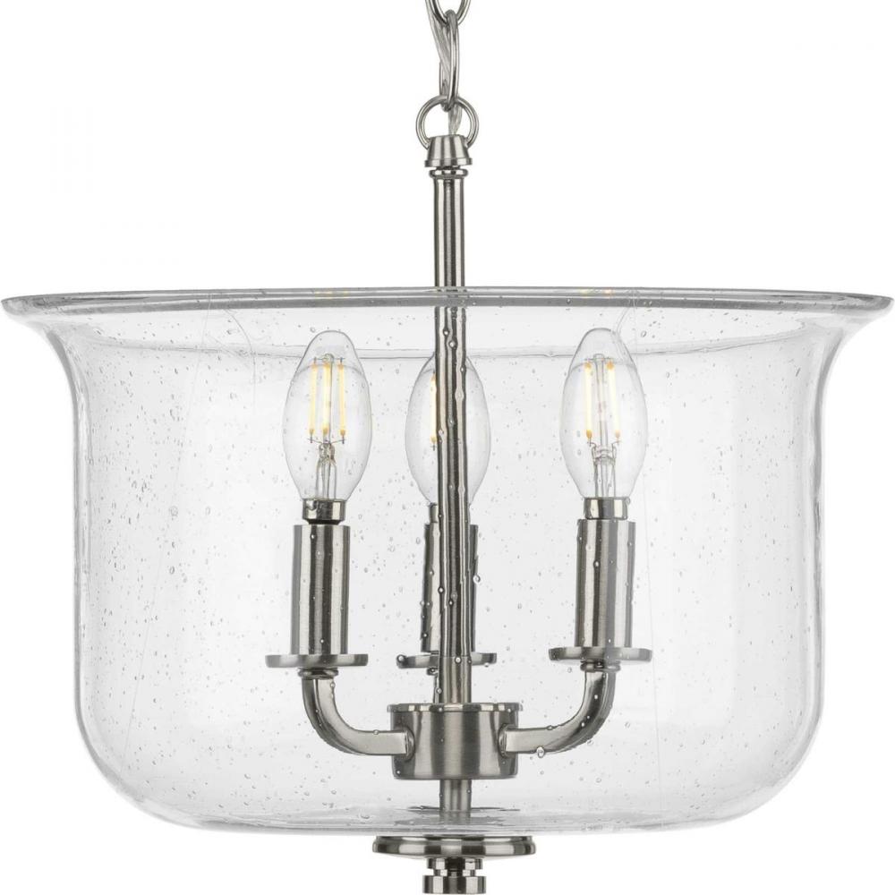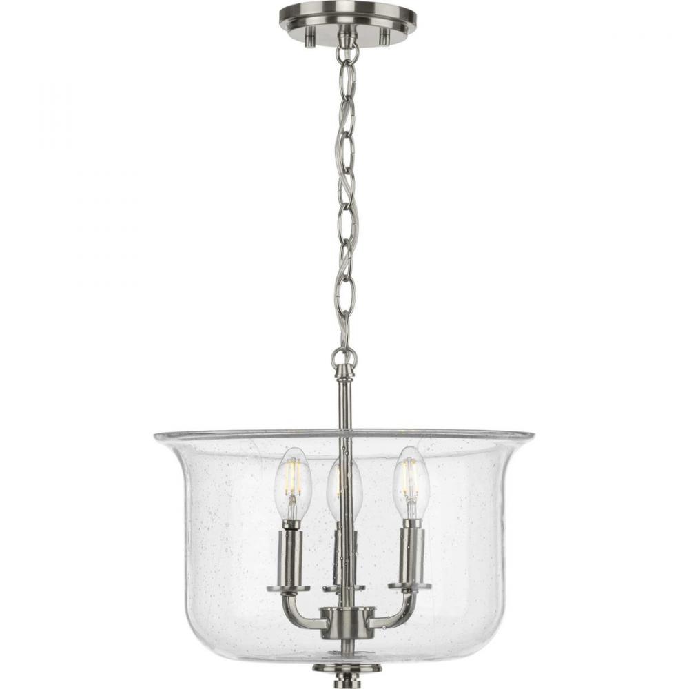 Immerse yourself in a home atmosphere primed for relaxation and inspired thinking with the beautiful craftsmanship of this semi-flush mount. Savor this fresh take on a classic light choice as your gaze traces graceful arms and clean, crisp lines coated in a gorgeous brushed nickel finish. Lightly seeded glass shade rest in shiny pedestal light bases that add an unexpected, but welcomed dash of modern personality to this clean, traditional design.
