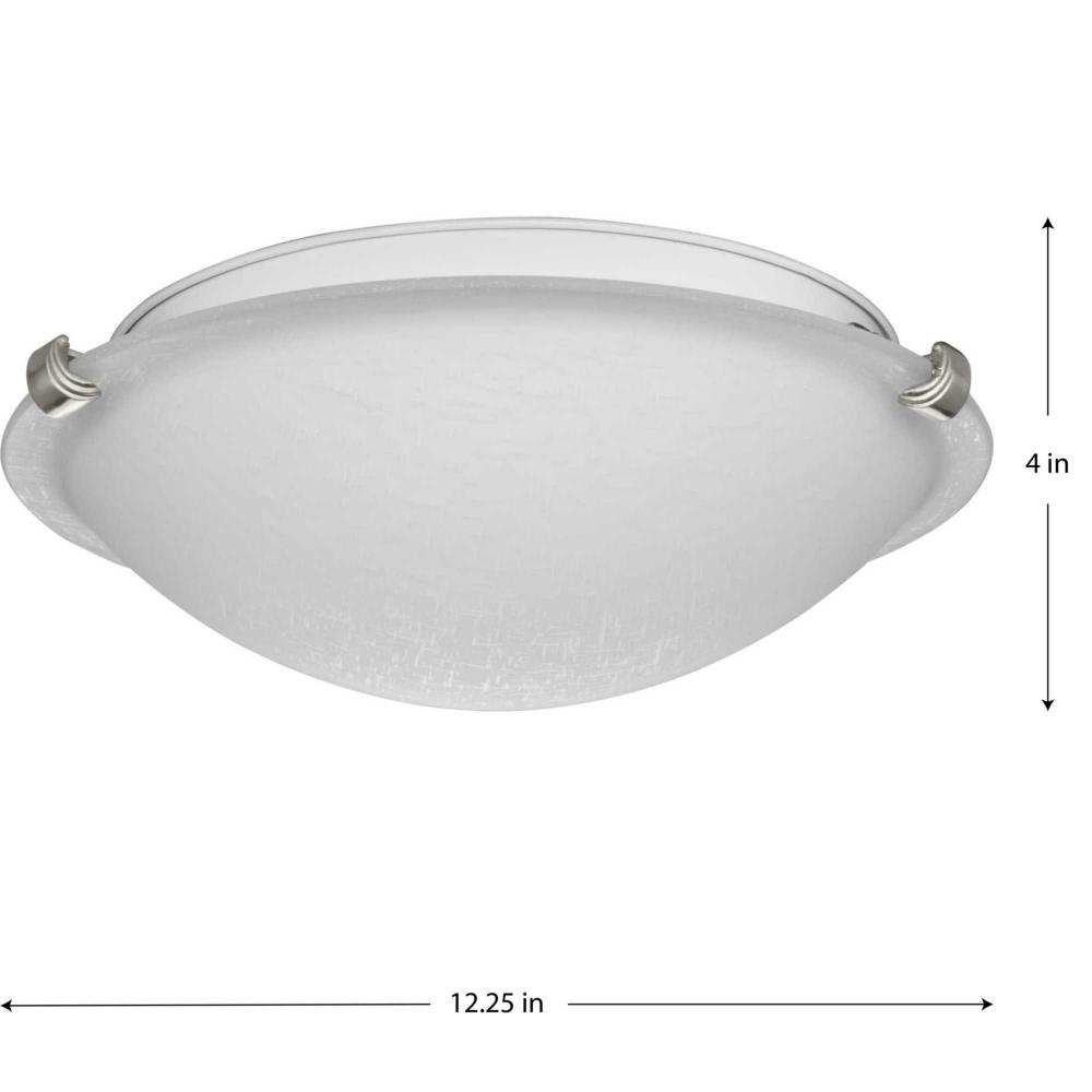 A domed, linen finish glass diffuser is discreetly supported from brushed nickel metal fittings. While outfitted with traditional sockets, these fixtures are for use only with LED lamps (2, 15-W medium base bulbs, sold separately) to maximize energy savings. Suitable for many decor settings, especially transitional and contemporary interiors.