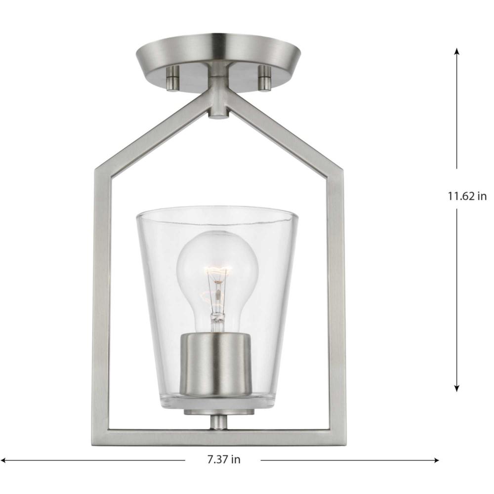 The semi-flush mount is finished in a gorgeous plated brushed nickel