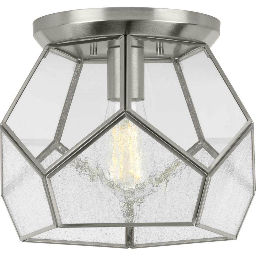 Glass panels create a shade that holds an industrial light base inside.;Geometric shapes form from the brushed nickel frame.;Inspired by modern geometric designs and contrasting elements, this bohemian-style flush mount is an attention-grabber for all the