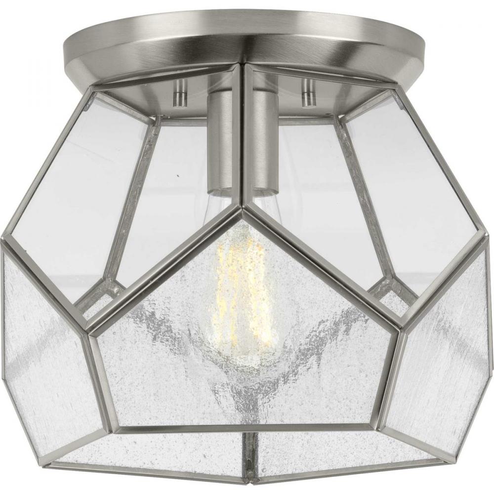 Inspired by modern geometric designs and contrasting elements, this bohemian-style flush mount is an attention-grabber for all the right reasons. Geometric shapes form from the brushed nickel frame. Glass panels create a shade that holds an industrial light base inside.