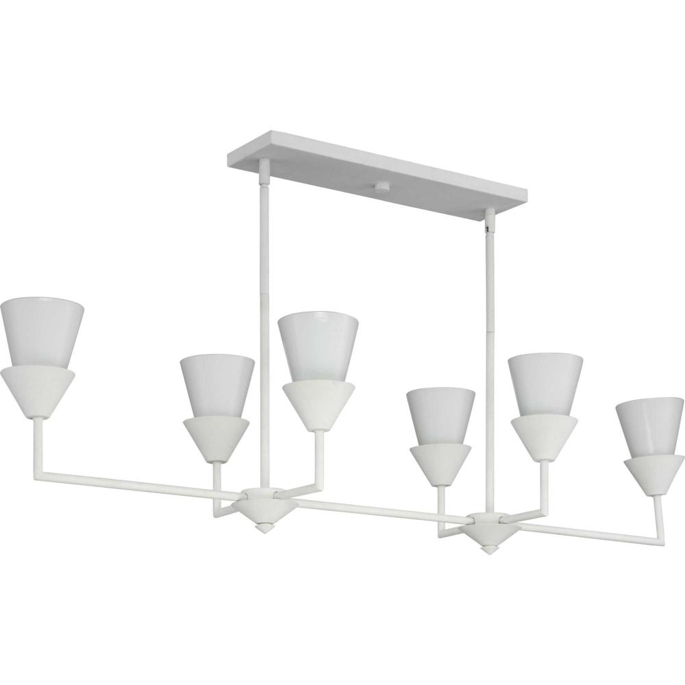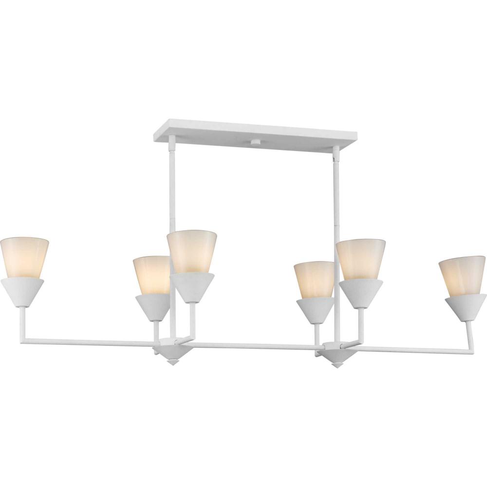 The Pinellas Linear Chandelier gets to the point with a modern expression of a timeless form. The signature dual conical motif has the elements artfully nested together to provide a pleasing diffusion of light from its opal glass shades. This fixture is part of the Progress Lighting Design Series, a lighting collection offering fashionable styles and affordable luxury lighting for the home.