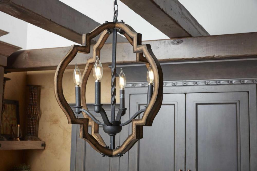 The statement-making four-light Spicewood pendant features a rich, solid wood surrounded in a classic quatrefoil pattern. Wrought iron metal fittings in a Gilded Iron finish are paired with a distressed pine frame to complement rustic and reclaimed design styles.