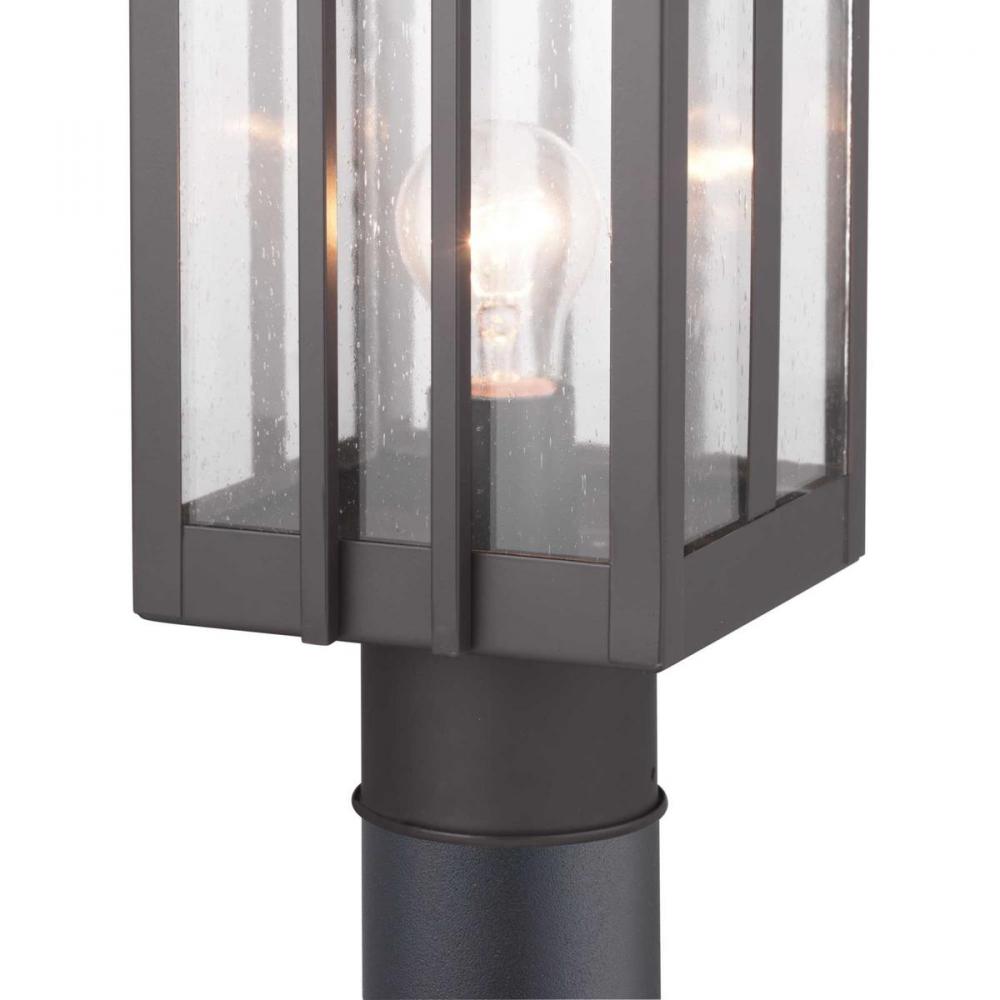 Geometric details in Boxwood’s design enhance Craftsman-inspired architecture. The one-light post lantern features clear seeded glass and finished in Antique Bronze which completes the authentic style.