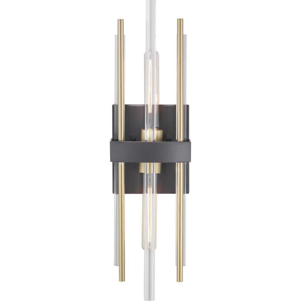 Suitable for sleek and sophisticated interiors, the Orrizo Collection's two-light wall bracket presents an artful arrangement of clear glass and golden metal rods that adorn a Black band. Geometric and artisan design influences complement both Modern and Luxe settings. Common applications for these statement-making fixtures include dining rooms and bedrooms and foyers.
