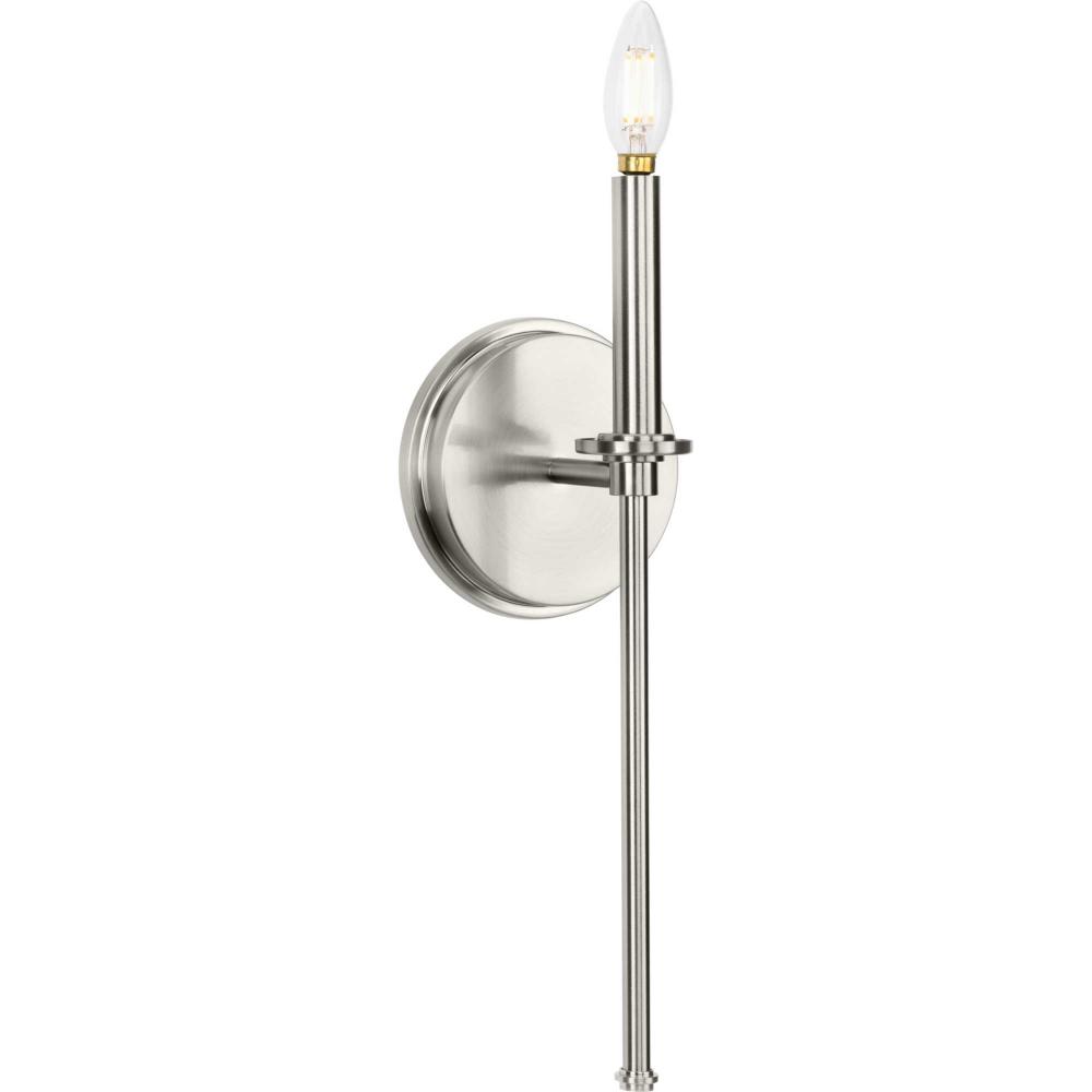 Feature a chic form with a bath vanity light from the Elara Collection. The slender frame with a stylized finial inspired by chess pawns is coated in a beautiful brushed nickel finish. For additional customization, Elara can be topped by a tapered or drum fabric shade or a clear glass cylinder.