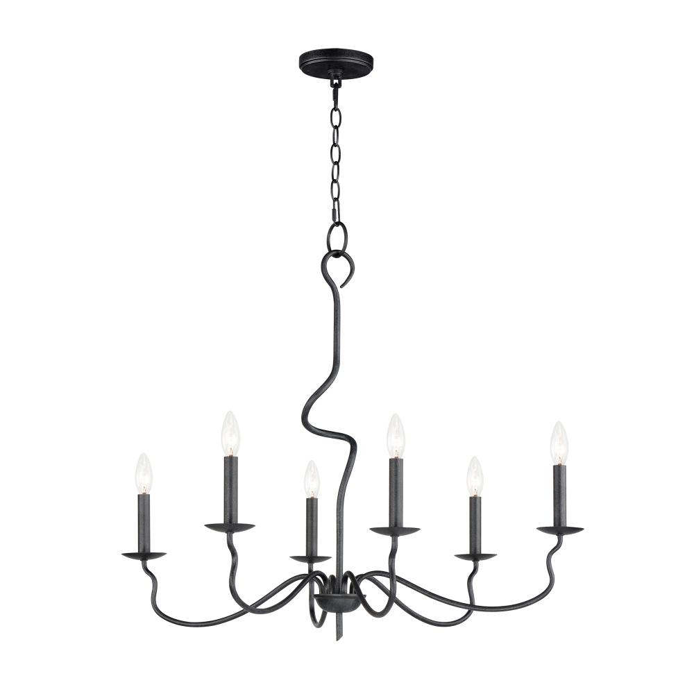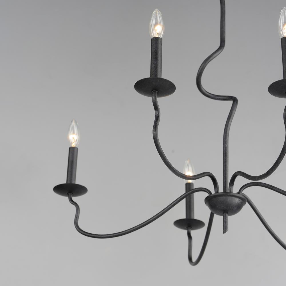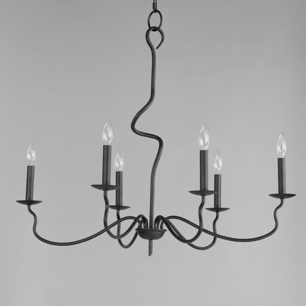 The sinuous form of thin arms outstretch and curve in a classic forged iron chandelier design. It seduces its audience with a wild turn at its center stem that ends with a charming hook detail replacing the conventional top loop. Completed in a Black Oxide