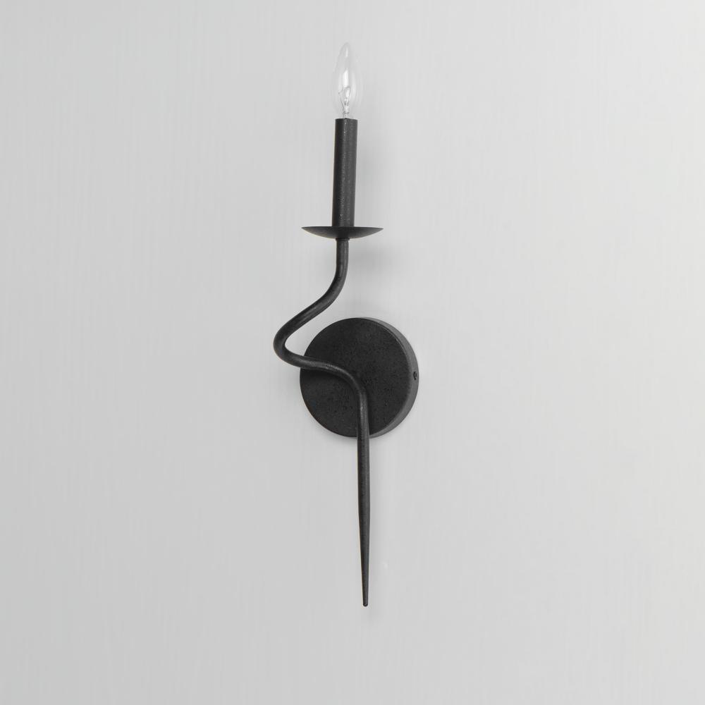 The sinuous form of thin arms outstretch and curve in a classic forged iron chandelier design. It seduces its audience with a wild turn at its center stem that ends with a charming hook detail replacing the conventional top loop. Completed in a Black Oxide