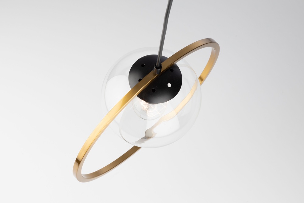 From the Lighting Pulse design firm, this Lugano collection single pendant features clear round glassware which is complimented by a vintage brass encasing on a black frame.