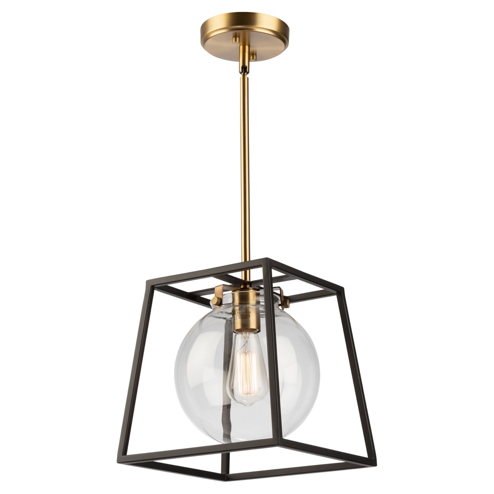 The "Bridgetown" collection single pendant features a clean and transitional design. The outer frame is a black tapper square while the interior is plated in a rich harvest brass. The glassware is clear and circular.