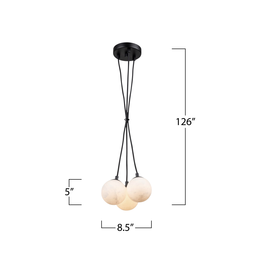 Hanging gracefully from the ceiling, the Camila collection exudes an ethereal glow, casting a soft and warm ambiance. Its meticulously carved alabaster diffuses the light in an elegant dance of shadows, creating a captivating interplay of textures. This cluster type pendants seamless design and timeless beauty make it a focal point, blending sophistication with a touch of celestial charm. 3 lite G9 pendant shown (available in a 7 light cluster as well)
