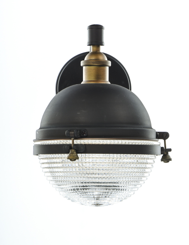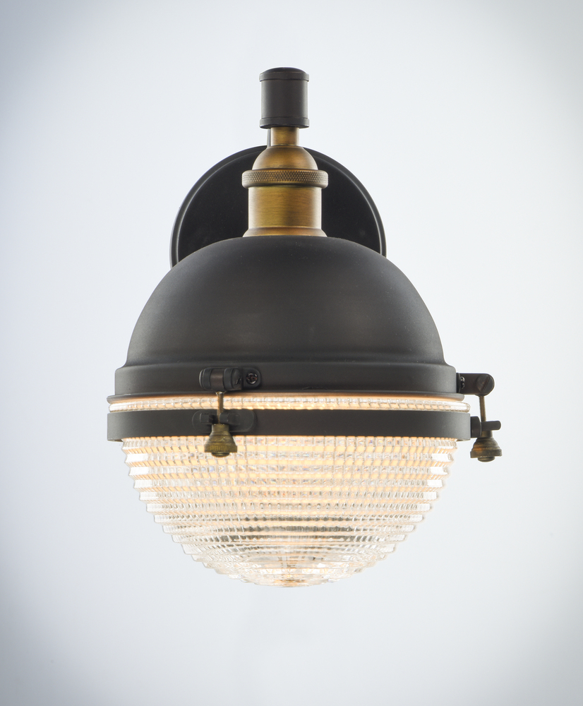 This nautical design features a solid dome of aluminum finished in Oil Rubbed Bronze with solid brass hardware finished in Antique Brass. The Clear prismatic glass diffuser completes the authentic look of this outdoor collection.