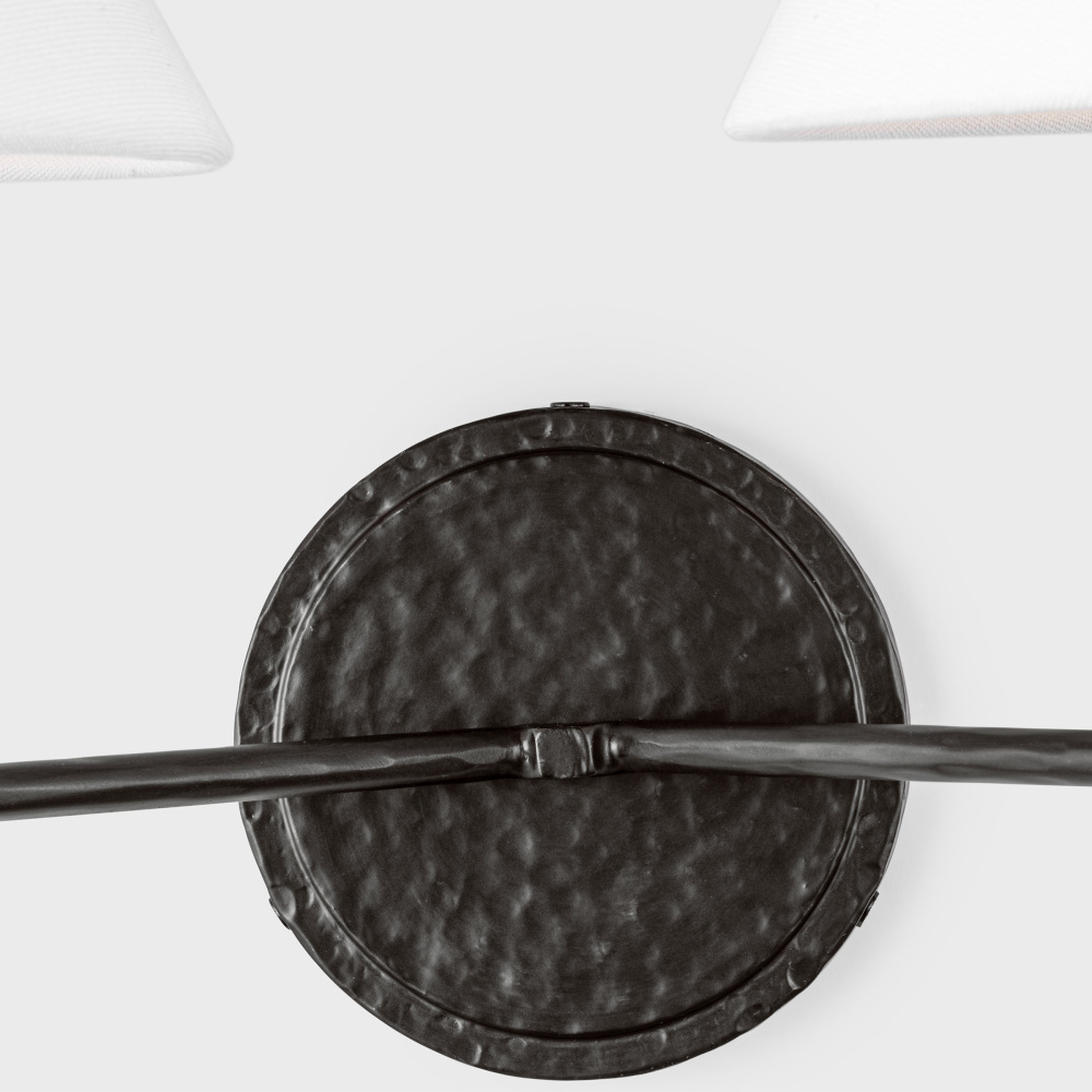 Crafted with Steel in a Aged Iron finish with white linen fabric shades
