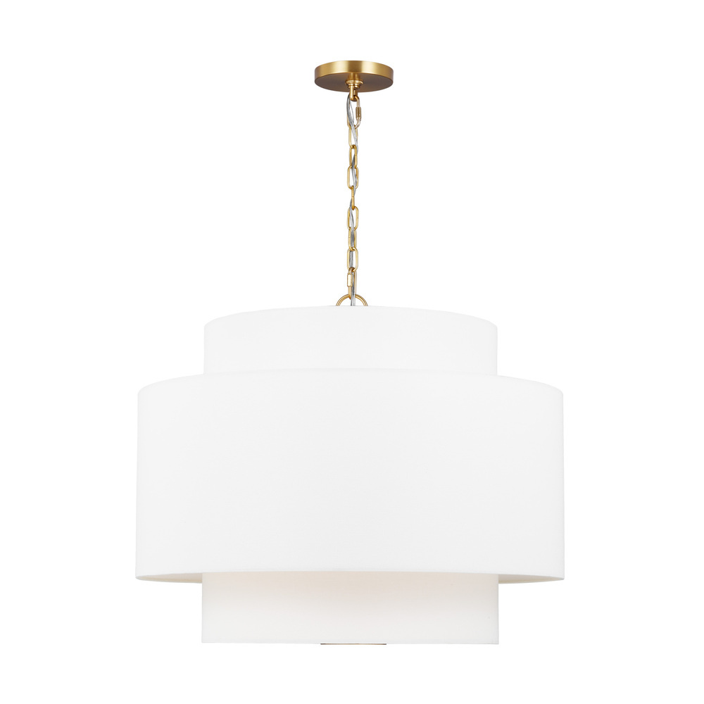 The Sawyer pendant in burnished brass is inspired by kate spade whimsical geometry and playful lines, Sawyer has a striking silhouette with graphically taped shades. A wide double tiered pendant shade with graphically taped shades. Great over a dining table or nook, or in multiples over an island.