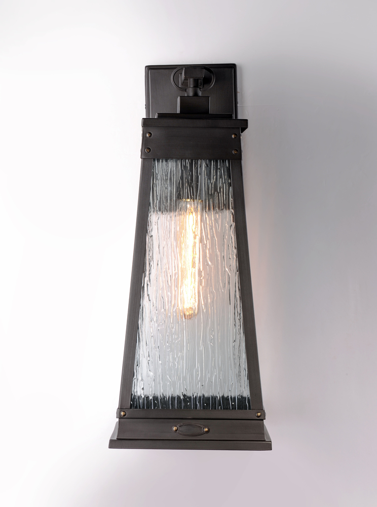 A tapered square shade finished in Olde Brass suspends from a bracket to replicate a nautical lantern. Panels of clear Ripple glass allow for the lamp to shine through while still diffusing the light. The medallion at the base of the shade and rivets along