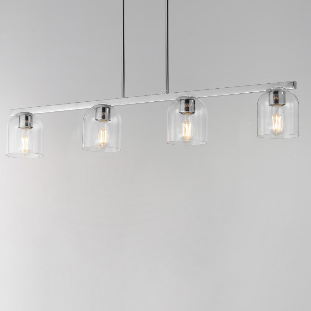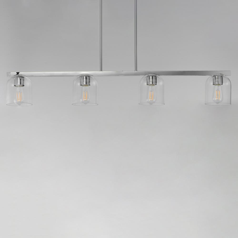 Cut-out metalwork curves around modern bell-shaped glass shades. The series includes pendants and bath vanities available in either Clear or a swirling Marble glass. Available in various complementary finishes: Polished Chrome, Matte Black, or Natural Aged