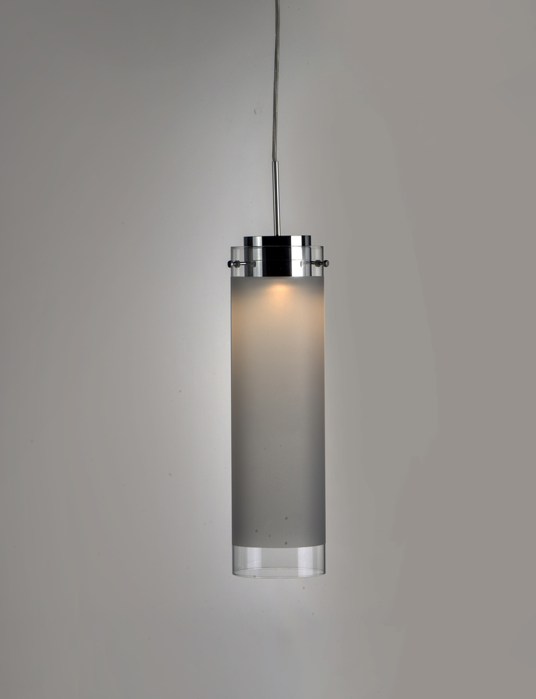 High tech LED modules are encased in die-cast housings finished in Polished Chrome. They support Frost glass cylinders with a Clear reveal on both ends. This classic design is a staple for contemporary pendants. Available in three sizes.