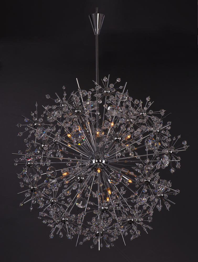 Spectacular display of Beveled Crystal beads of various sizes which are mounted on sculptures Polished Chrome metal formations which will sure to be the focal point of your room. The high power Xenon bulbs add sparkle to the crystal while producing a natu