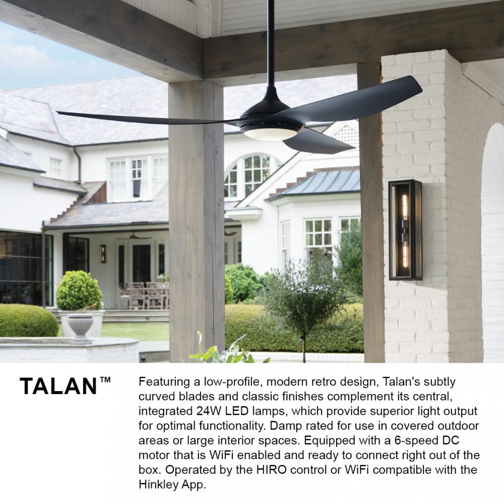 Featuring a low-profile, modern retro design, Talan’s subtly curved blades and classic finishes complement its central, integrated 24W LED lamps, which provide superior light output for optimal functionality. Damp rated for use in covered outdoor areas or large interior spaces. Equipped with a 6-speed DC motor that is WiFi enabled and ready to connect right out of the box. Operated by the HIRO control or WiFi compatible with the Hinkley App.