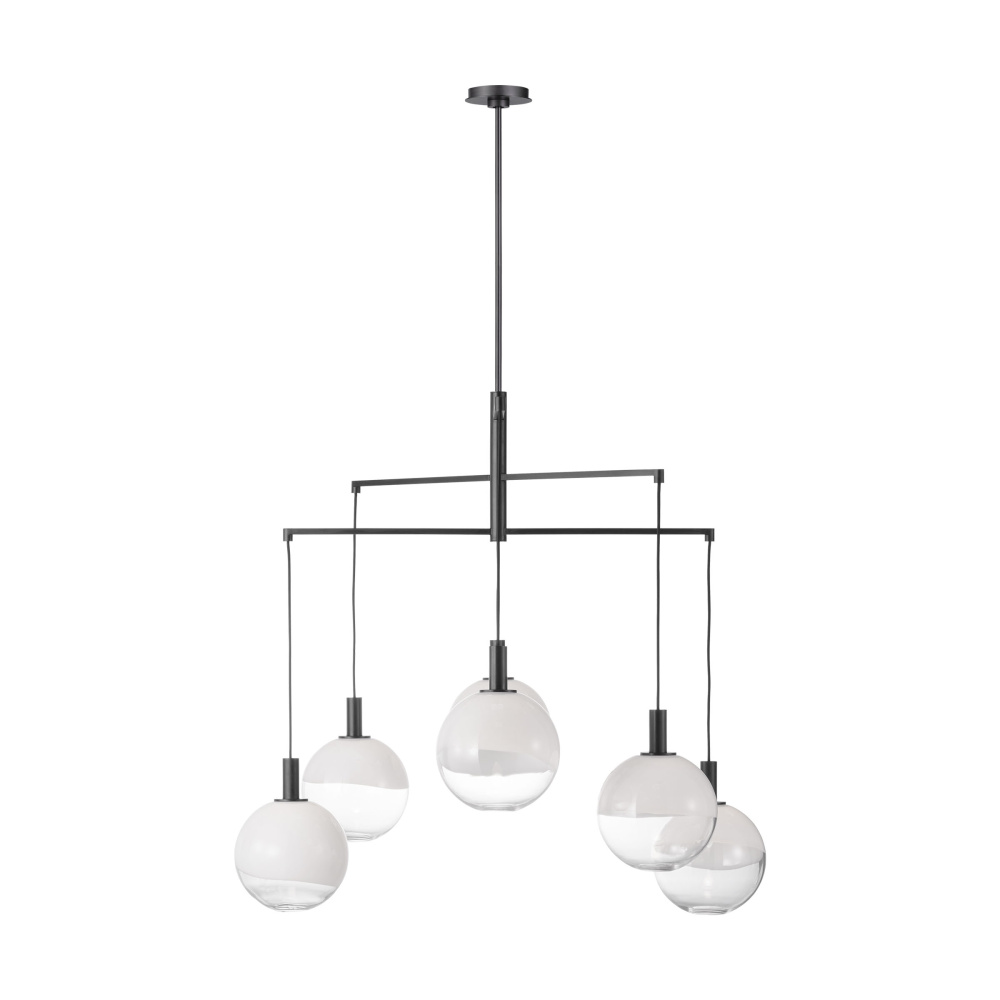 The Torian collection by Sean Lavin draws inspiration from sculptural hanging mobiles. Multiple arms with fabric cords suspend beautiful glass globe shades with an ombre effect, transitioning from milk to etched clear glass. Ideal for entryways and dining rooms, the Torian chandelier will lend a sophisticated artistic touch to interior spaces.