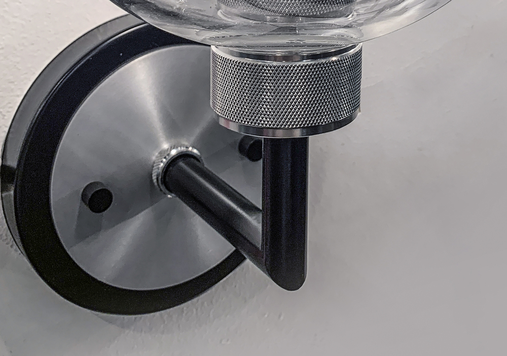 Machined and knurled sockets are finished in Brushed Aluminum which gives stark contrast to the Black round tube frames. Heavy weight Clear hand-blown glass spheres adds scale to this industrial classic.