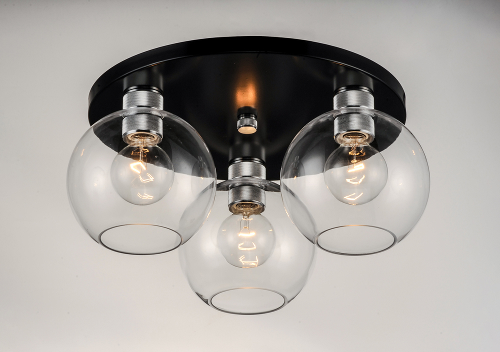 Machined and knurled sockets are finished in Brushed Aluminum which gives stark contrast to the Black round tube frames. Heavy weight Clear hand-blown glass spheres adds scale to this industrial classic.