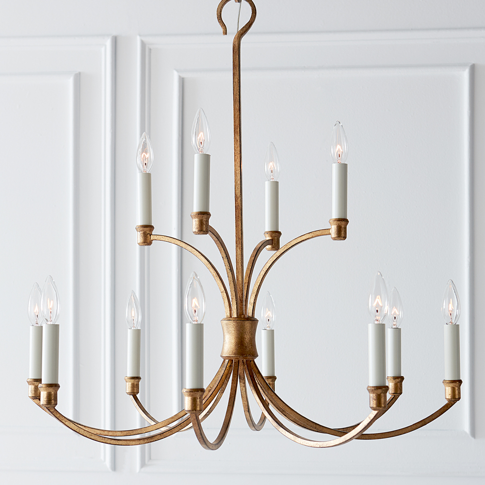 The Westerly twelve light multi-tier chandelier in antique gild makes a stunning addition to an entryway, great room, or above a large dining table. Designed by Chapman & Myers, Westerly features flowing arms and an exposed candelabra. The sculpted lines and hook with loop detail at the top and on the canopy lend designer flair and polish. Select the best size for your space and tailor the look with either Antique Gild for a chic, metallic feel or Smith Steel for a more rustic tone.
