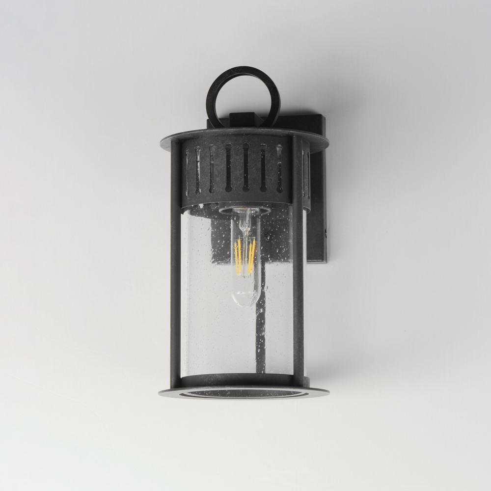Inspired by the rounded towers of Windsor Castle, this outdoor lighting collection features a hand-applied Black Patina finish on Stainless Steel. A slotted filigree along the top of the cylinder frame allows light to escape, while the clear seeded glass o