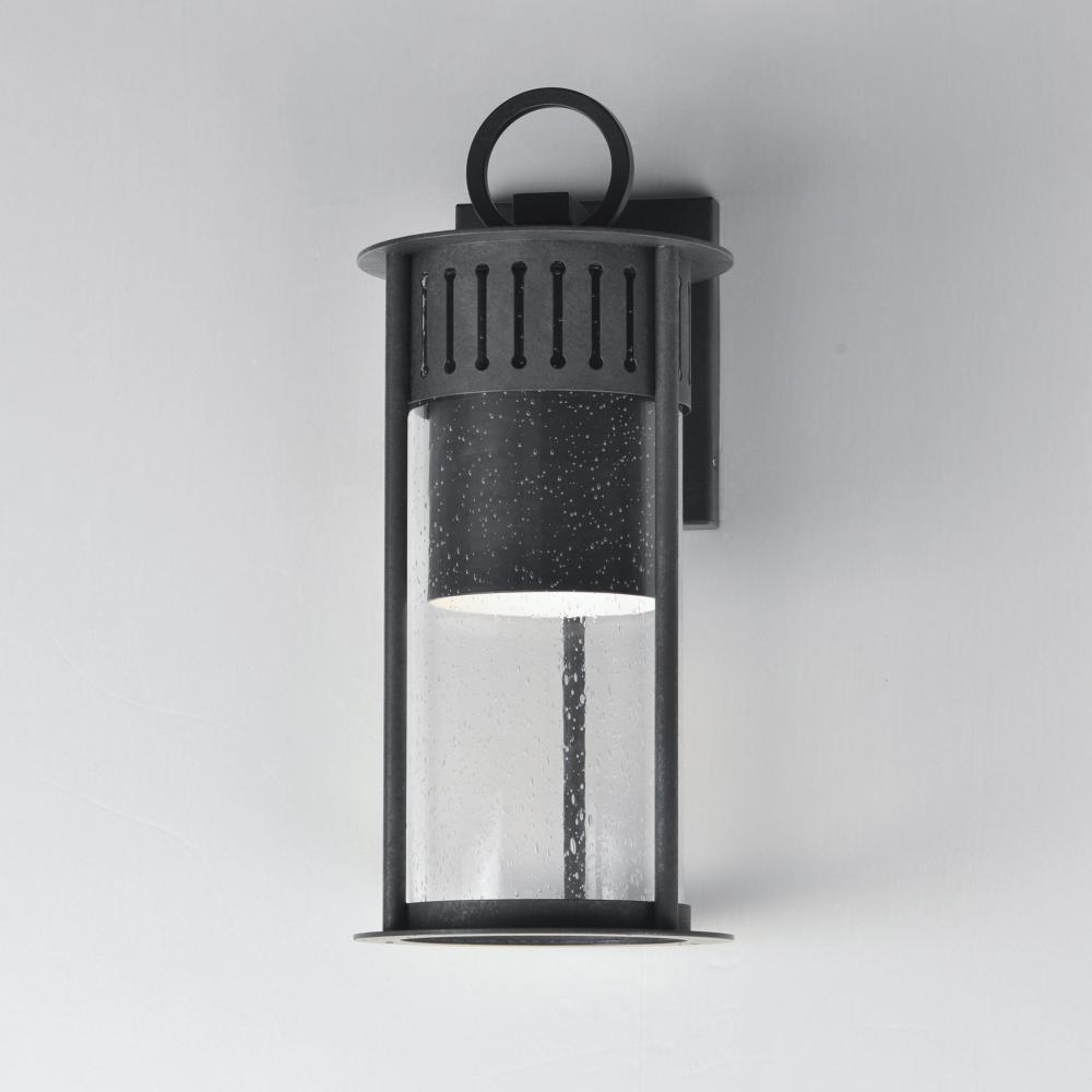 Inspired by the rounded towers of Windsor Castle, this outdoor lighting collection features a hand-applied Black Patina finish on Stainless Steel. A slotted filigree along the top of the cylinder frame allows light to escape, while the clear seeded glass o