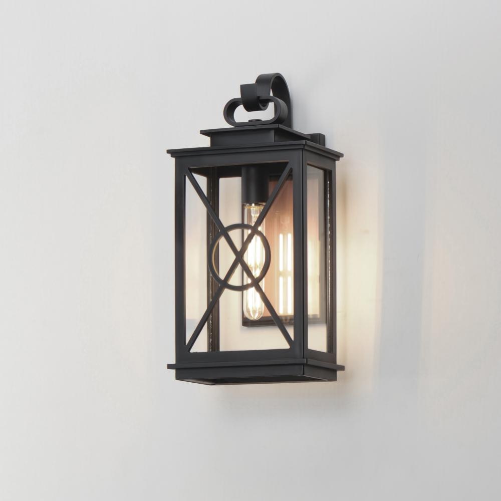 Styled as a classic early American coach lantern, the Yorktown sconces offer an established exterior design aesthetic with the modern engineering to withstand the harshest climates. A crossing pattern of the material wraps clear glass panes that protects t